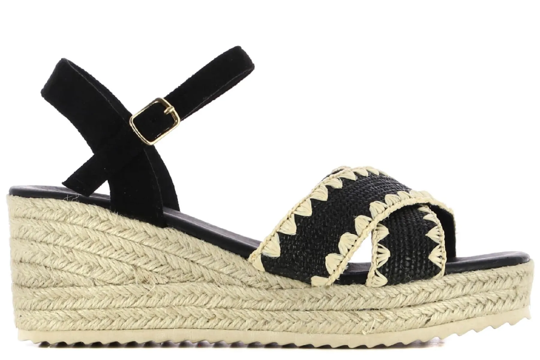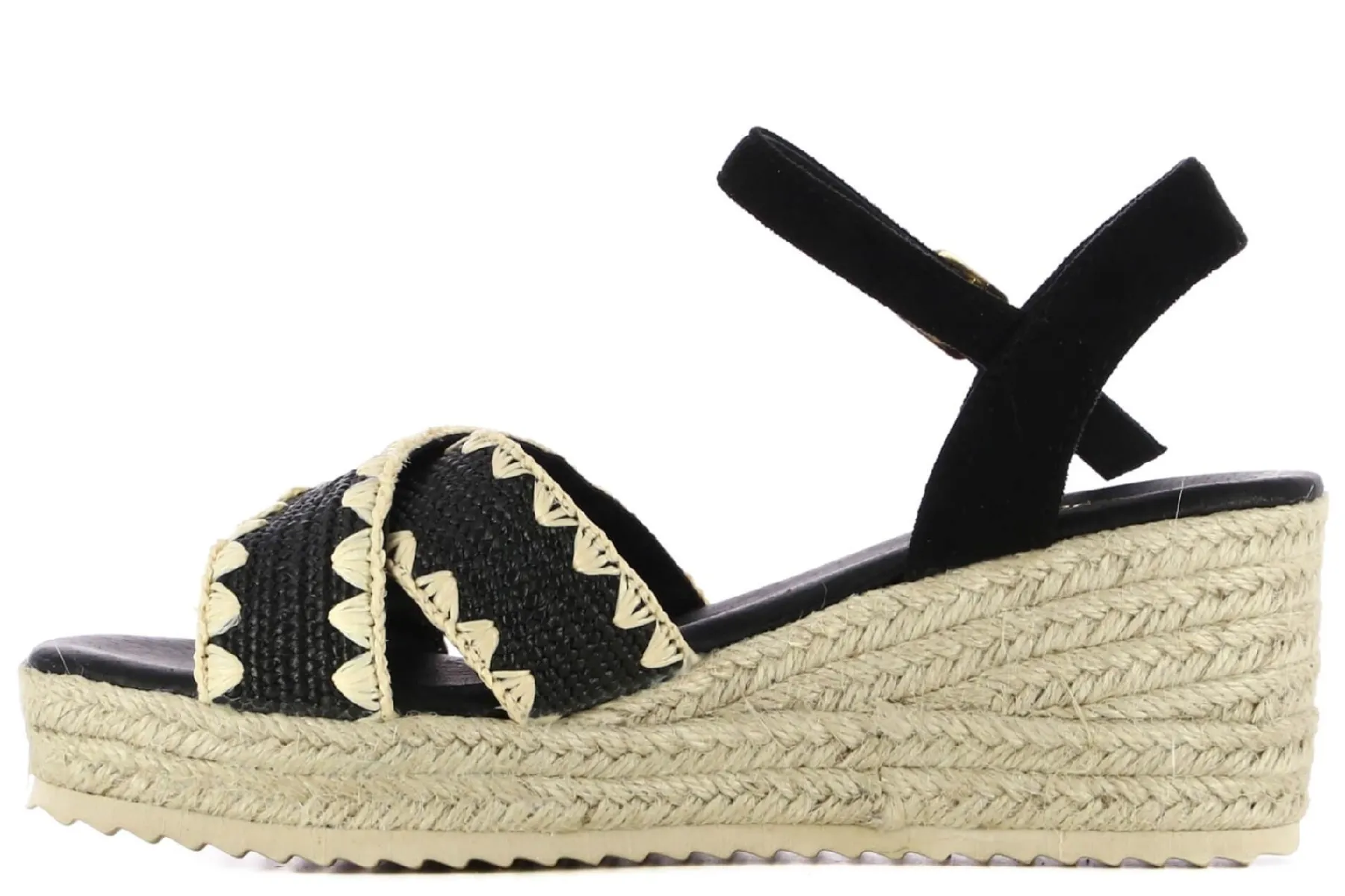 Altura tacón (cm): 7.0 Altura plataforma (cm): 3.0Color: Negro Material Exterior: Rafia Plantilla: Piel Cierre: Hebill…