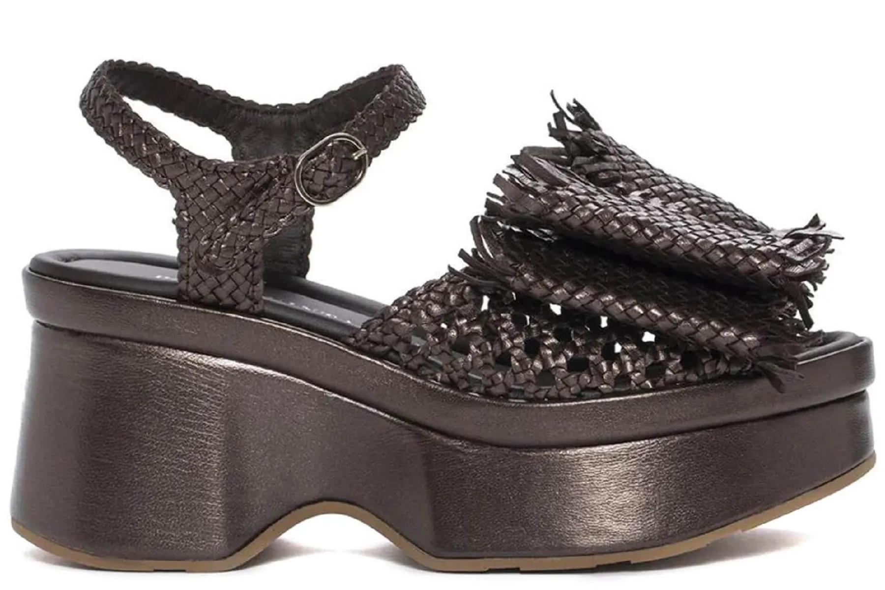 Color: Marrón Material Exterior: Piel Cierre: Hebilla Puntera: Abierta Forma tacón: Cuña Acabado: Trenzado Suela: Go…